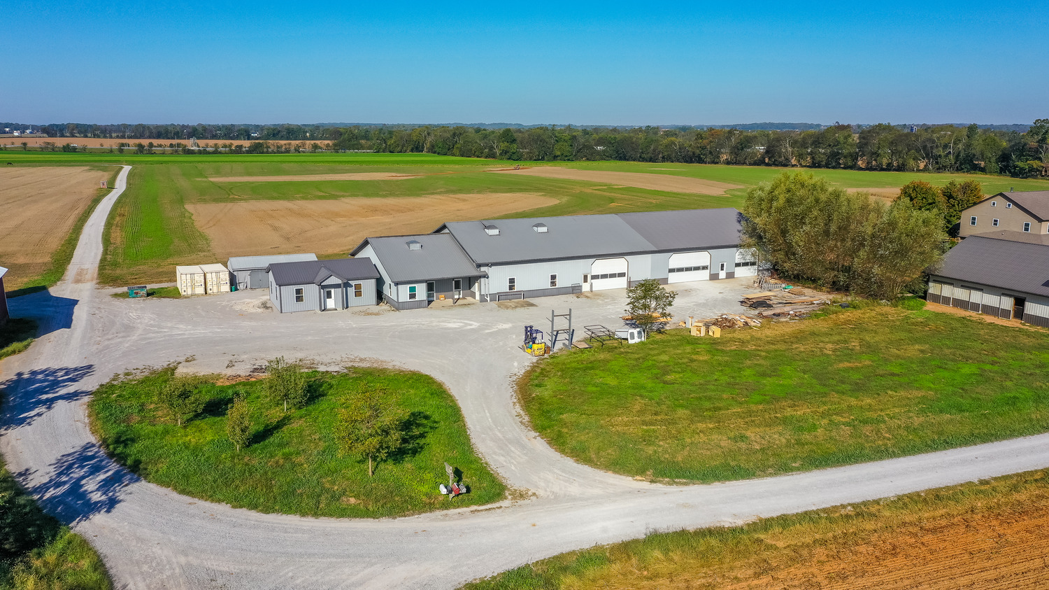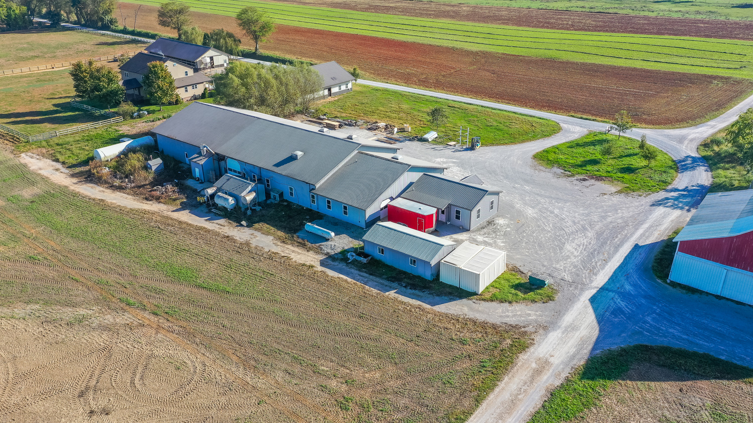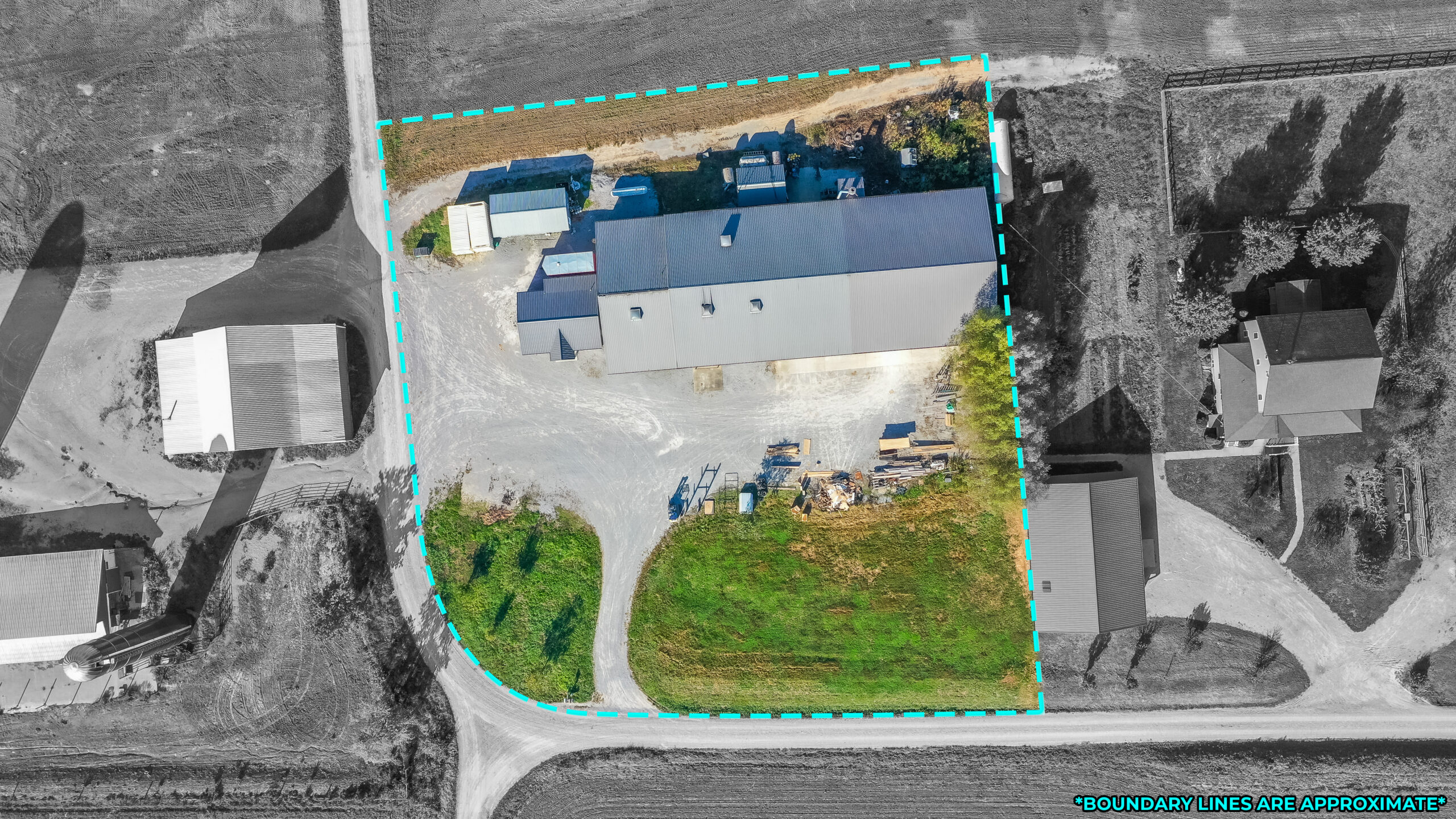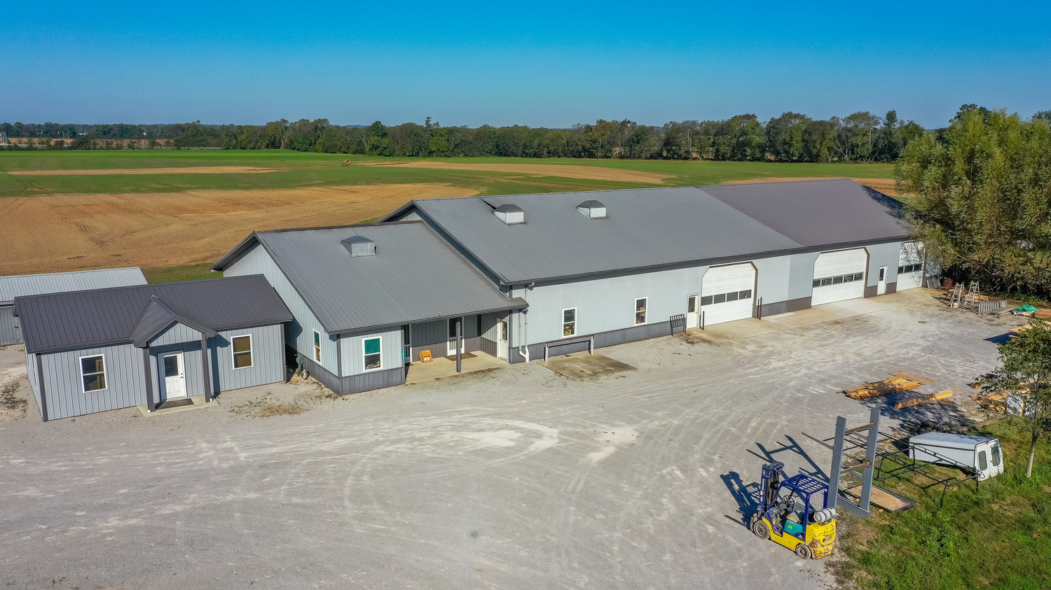 2 acres +/-, 9600 sq ft, 60×160 building with heated concrete floors. Fully insulated w/ metal on ceiling & walls. Office area is approx. 1200 sq ft w/ front porch. 1 toilet room & lunchroom. Office and lunchroom are dry walled & has a floating floor on top of heated concrete.