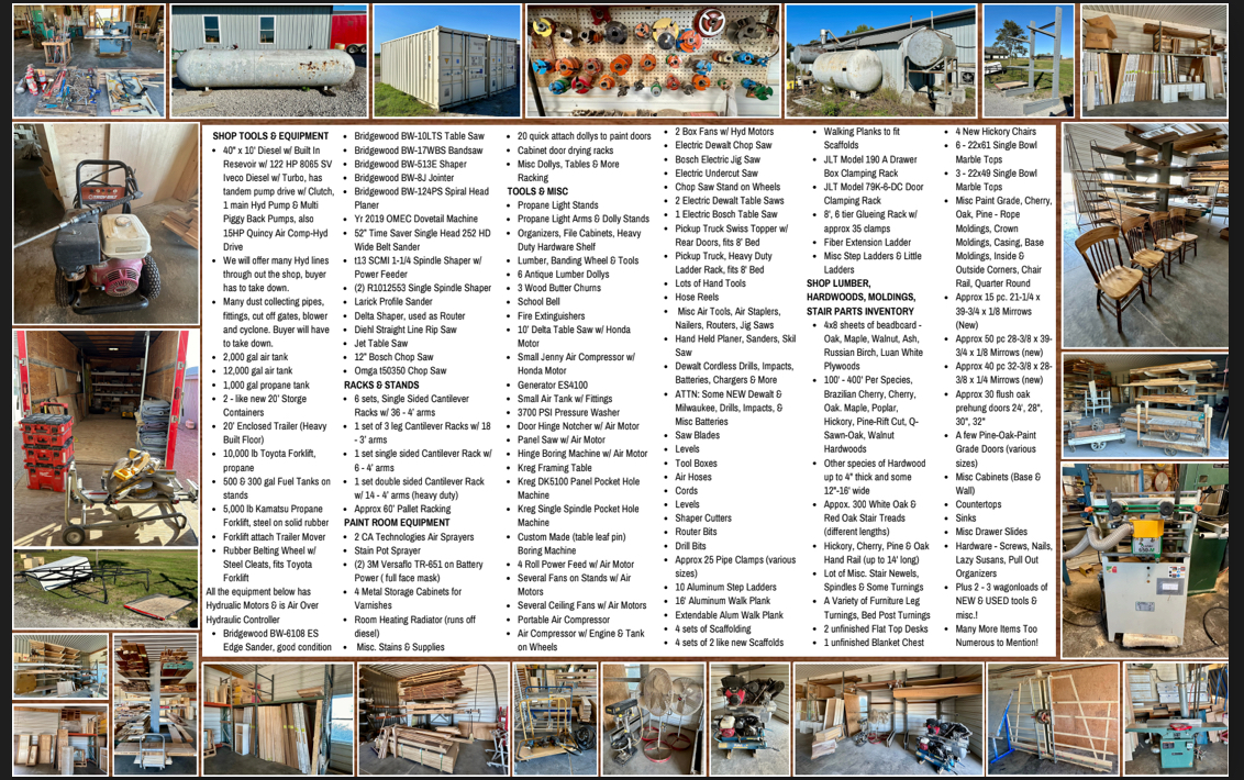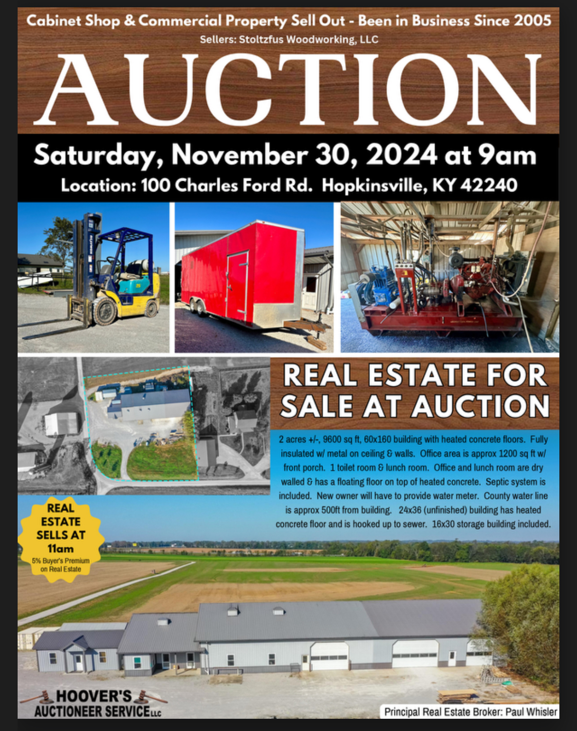 Auctioneers note: Join us for a full day of cabinetry equipment, construction tools, building supplies, and a commercial building. If you are looking to start a cabinetry business or are in need of a commercial building, this is the perfect opportunity for you.