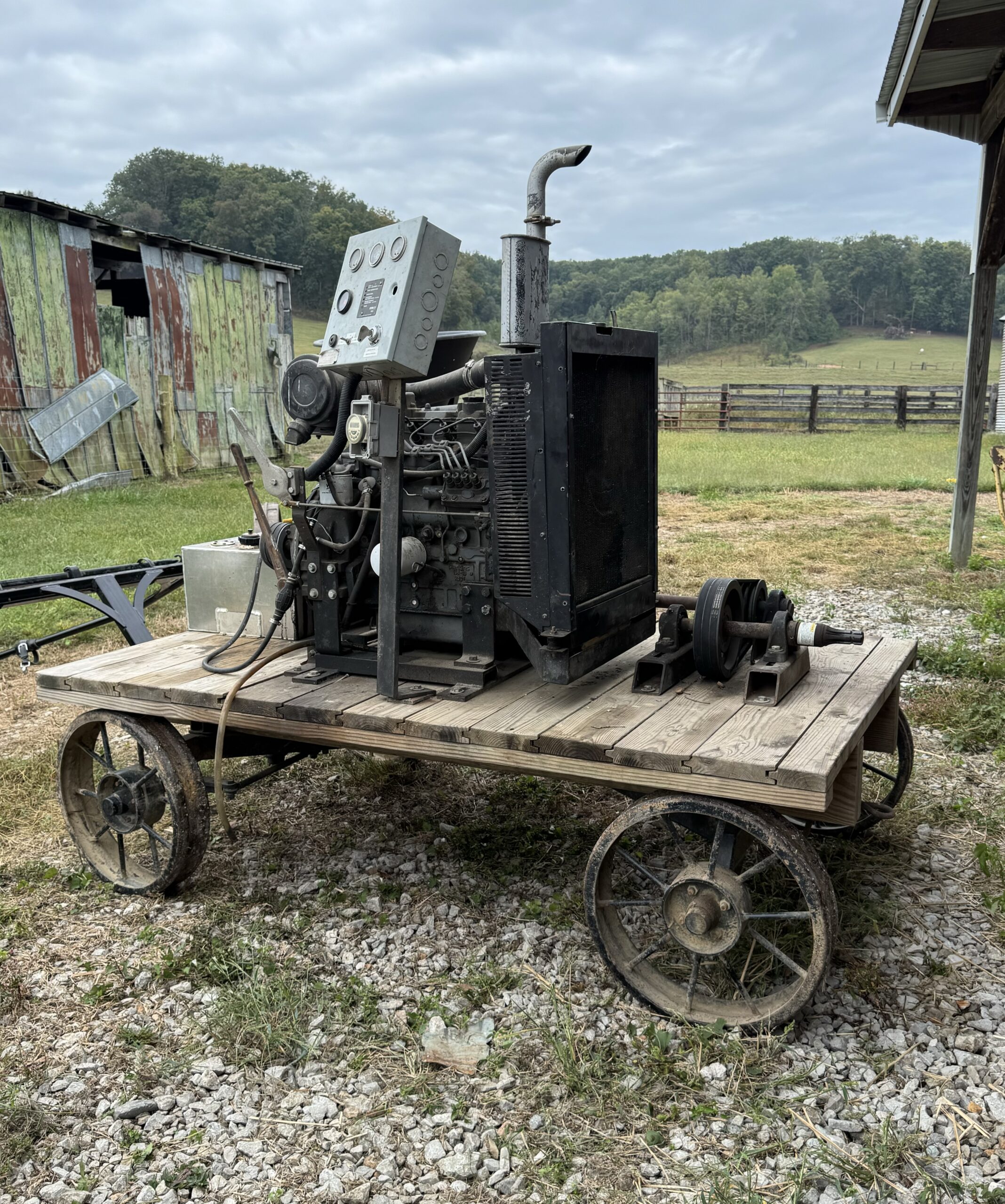 - 2¼ Perkins Diesel Motor w/ Rockford Clutch Power takeoff w/ top shaft. On a Pioneer 1 ton wagon gear, 14.1 Tires. Good cond