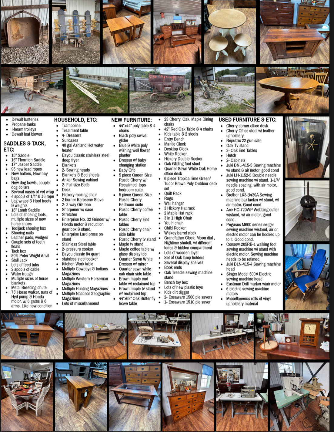 Join us for a large on-site auction featuring a great variety of quality items from the Girod family! This auction includes horse-drawn farm equipment, shop tools, household goods, business sell-out of new furniture, and more! Whether you’re a farmer, woodworker, or looking for clean household items, there’s something for everyone!