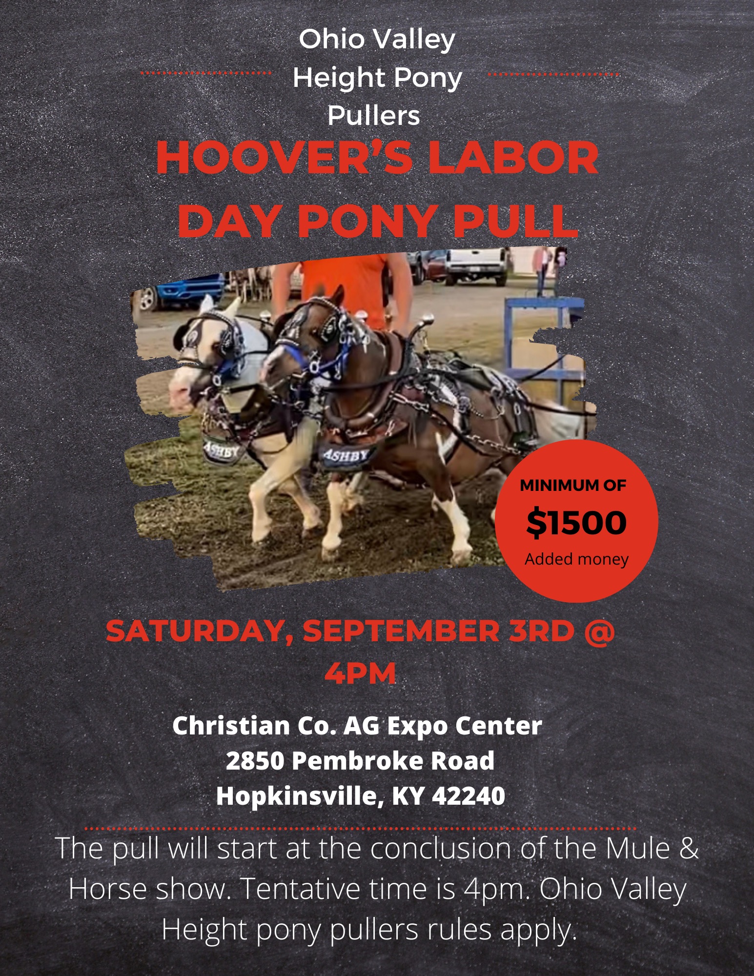Following the mule and horse show, we will also have a pony pull. Ohio Valley Height Pony rules will apply. $1500 plus added money for pony pull.