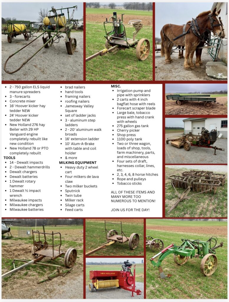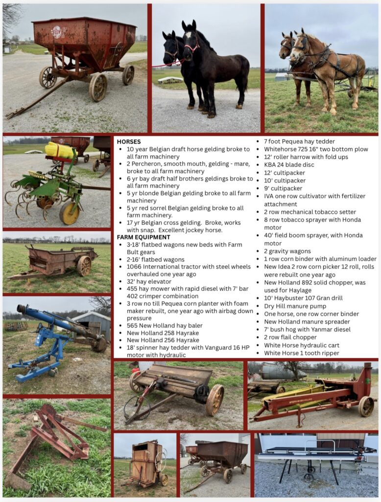 From draft horses and antique farm equipment to New Holland machinery, wagons, sprayers, tools, and hard-to-find pieces — this is a can’t-miss country auction.